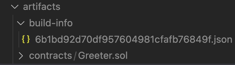 .json metadata file with Hardhat, compile the contract using the npx hardhat compile command. The compiled artifacts will be saved in the artifacts/ directory and the <dynamic_hash>.json metadata file will be under artifacts/build-info and used for verification. See Sourcify Hardhat metadata documentation here.