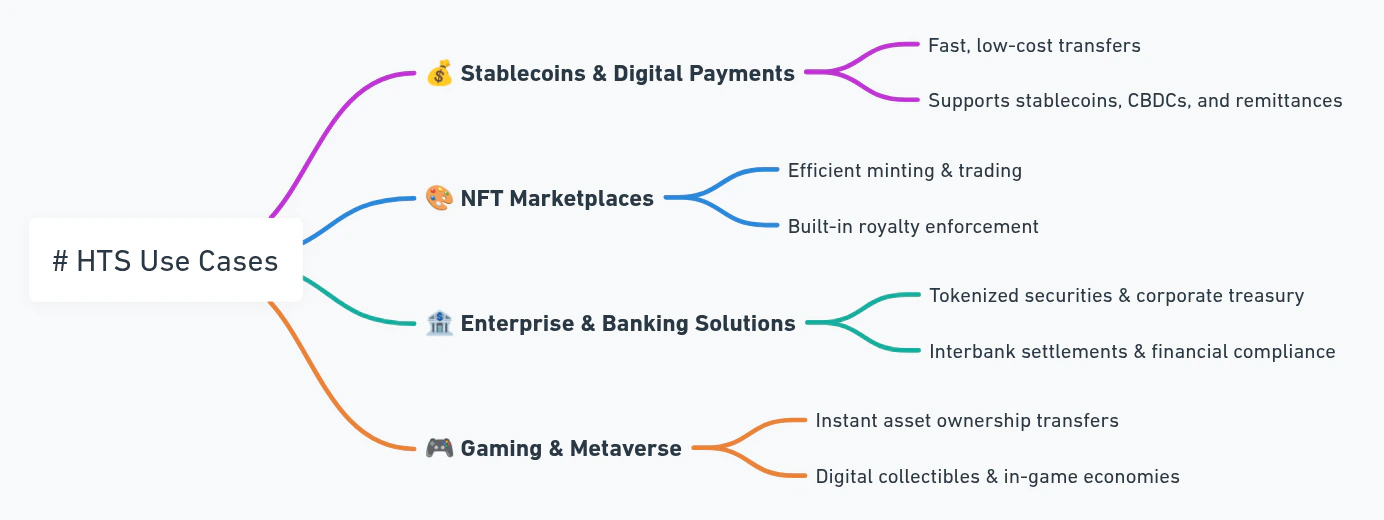 HTS powers a wide range of applications across finance, gaming, enterprise, and digital assets. It enables high-speed, low-cost transfers for stablecoins, CBDCs (central bank digital currency), and remittances, making digital payments faster and more efficient. Its NFT marketplace solutions support efficient and affordable minting and trading of non-fungible tokens (NFTs). For enterprises and banking, HTS facilitates tokenized securities, corporate treasury operations, and interbank settlements. In gaming and the metaverse, it powers instant asset ownership transfers for in-game items, digital collectibles, and virtual economies.