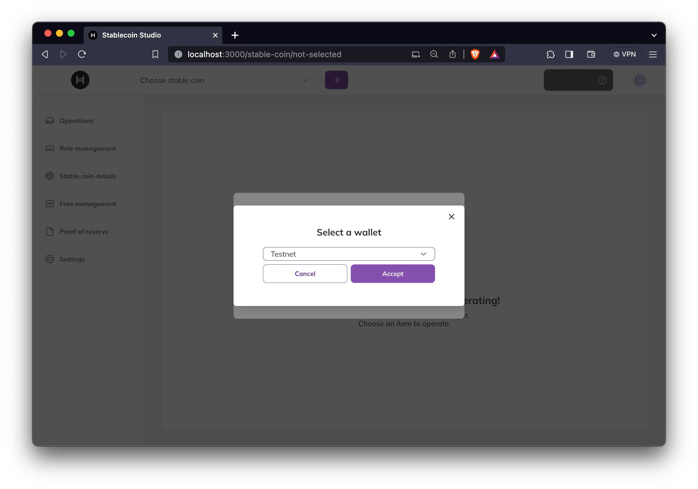To operate your stablecoin, connect your wallet to the platform. After successful authentication, select the stablecoin you wish to interact with from the drop-down list of available coins. Once the stablecoin information is loaded, navigate to the “Operations” tab. You’ll see a variety of actions and your accessible operations will be tied to the roles assigned to your account for the chosen stablecoin. Here’s a quick rundown of what each operation allows: